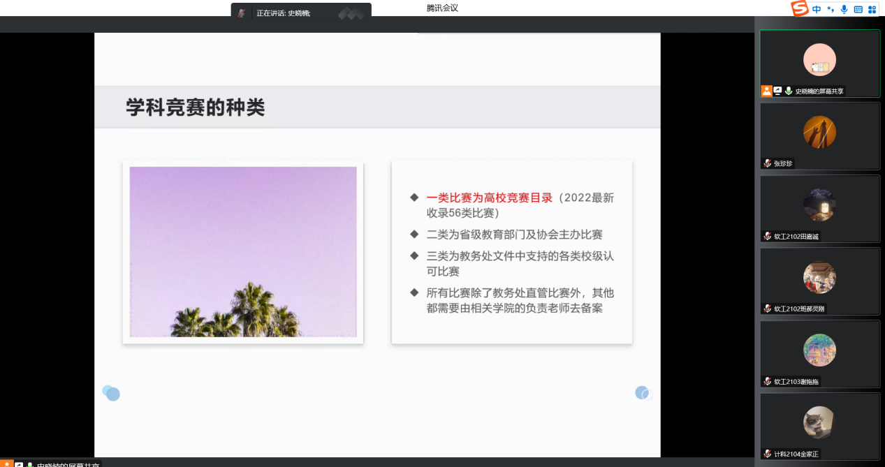 会上,史老师从学科竞赛的种类、历年获奖情况、竞赛对考研与就业的促进作用等三方面进行全面解读和分析,重点讲解了中国老员工服务外包创新创业大赛、蓝桥杯全国软件和信息技术专业人才大赛、中国高校计算机大赛等计算机类重点赛事相关情况,她鼓励同学们提前了解各类赛事特点,结合公司专业设置情况,充分利用支持政策和优势资源积极参加各类创新创业活动,为将来的就业、考研打好基础。