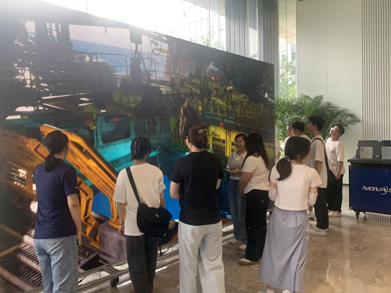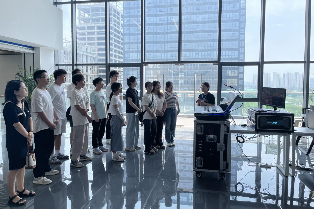 诺瓦星云技术负责人带领实践团同学们参观公司拳头产品。实践团逐一参观了诺瓦星云的各个核心工作区域,包括公共办公区、显示控制系统区、测试实验室、虚拟测试拍摄场地等区域,对公司整体环境有了更加全面而深入的了解。