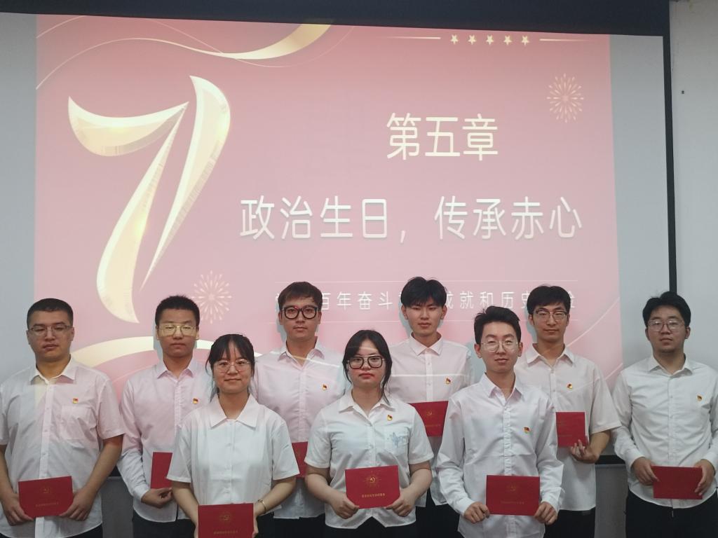 活动中,全体党员面对鲜红党旗高举右拳庄严宣誓,铿锵有力、饱含深情地再次作出“为共产主义奋斗终身”的庄严承诺;支部集中开展”学党史,强党性,传党魂”专题党课学习,通过学习建党节的由来、党徽的意义、中国共产党全国代表大会的光辉历程等内容重温党的历史,汲取奋进力量;9名新老党员代表跨越时间界限,重读入党志愿书,重温入党初心,表达了永远忠诚跟党走的理想信念;支部为党员代表过集体政治生日,赠送政治生日贺卡,勉励大家时刻不忘自己的“第一身份”,发挥先锋模范作用;支部书记指出,支部获评“tyc5997太阳集团先进基层党支部”是对支部前期工作的高度肯定,希望大家满怀信心、踔力前行、重整行装,争取更好成绩。